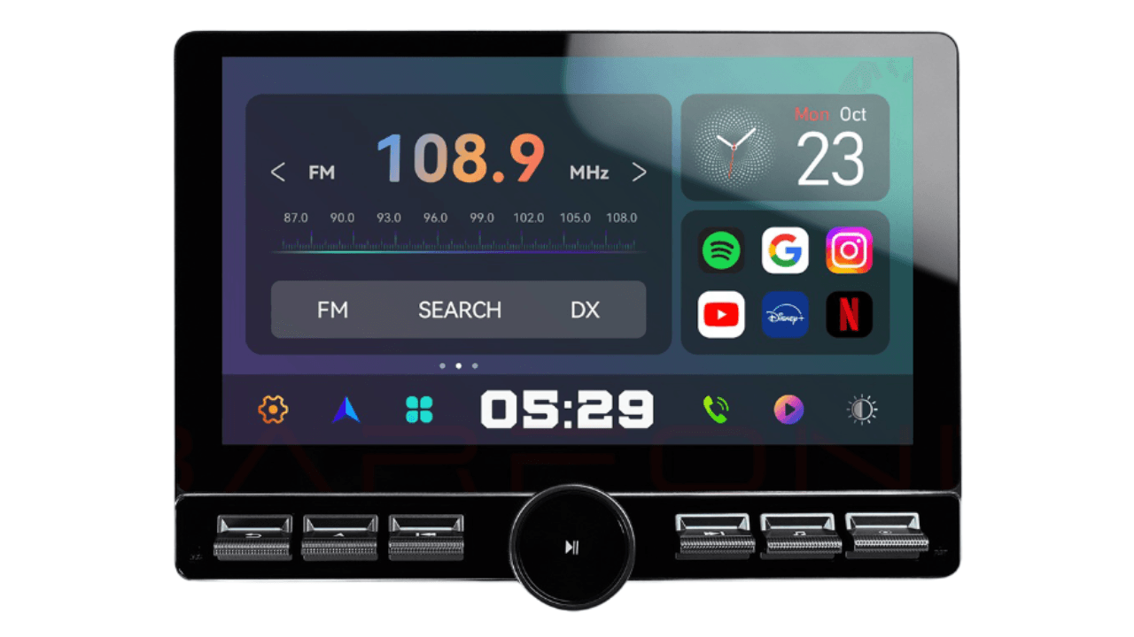 Multimedia Car Audio System with Android v10 OS Quad Core 1.3 GHz Processor, 2GB DDR3 RAM 32GB Storage, Wireless Apple CarPlay and Android Auto, 10.1 Inch Capacitive Touch Screen  1.3K Display, 2.5D Gorilla Glass QLED panel, High-end AM / FM (RDS) Tuner, Wi-Fi Ready, Navigation Ready, Fast Boot, Bluetooth v5.0 with Twin Connect, Rear USB (Type A) X 2, Rear AV input, Steering Wheel control input, Rear View Camera input, DSP 16 Band EQ, Time alignment, Phone LINK, 50×4 Watts Max Power